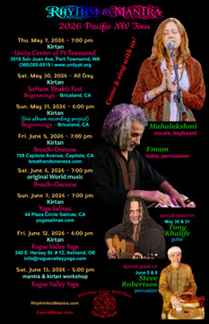 Thurs. May 7/2026 - Pt Townsend, WA a spiritual journey through Kirtan & Music Sat. May 30/2026 - Briceland, CA 3rd annual - Sohum Bhakti Day Fest Sun. May 31/2026 - Briceland, CA live album recording project Fri. June 5/2026 - Capitola, CA a spiritual journey through Kirtan Sat. June 6/2026 - Capitola, CA an evening of original music from the heart Sun. June 7/2026 - Salinas, CA a spiritual journey through Kirtan & Music Fri. June 12/2026 - Ashland, OR a spiritual journey through Kirtan & Music Sat. June 16/2026 - 5:00 PM - 7:00 PM mantra and kirtan singing workshop |