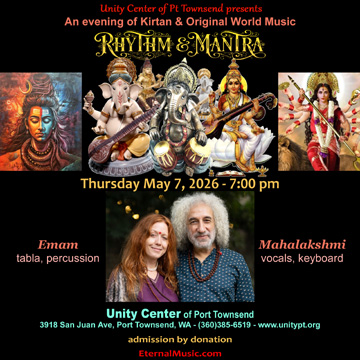 Kirtan & Music Thursday May 7/2026 - 7:00 PM Rhythm & Mantra Mahalakshmi (vocals, keyboard) Emam (tabla, percussion) Unity Center of Port Townsend 3918 San Juan Ave, Port Townsend, WA (360)385-6519 www.unitypt.org | ||||||||||||||||||||||