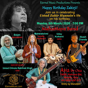 Happy Birthday Zakirji! Join us in celebrating the life of Ustad Zakir Hussain on his birthday. Saturday, 7th February, 2026 - 7:00 PM MahaMaya Band Mahalakshmi - vocals, keyboard Uday Kulkarni - tabla Akash Chanda - bass Emam - percussion special guest Ustad Chhote Rahimat Khan - sitar AYA by Osa 740/B, Ashvem Rd, Morjim, GOA / +91-9920-297-577 |