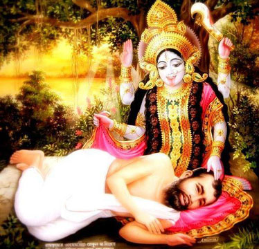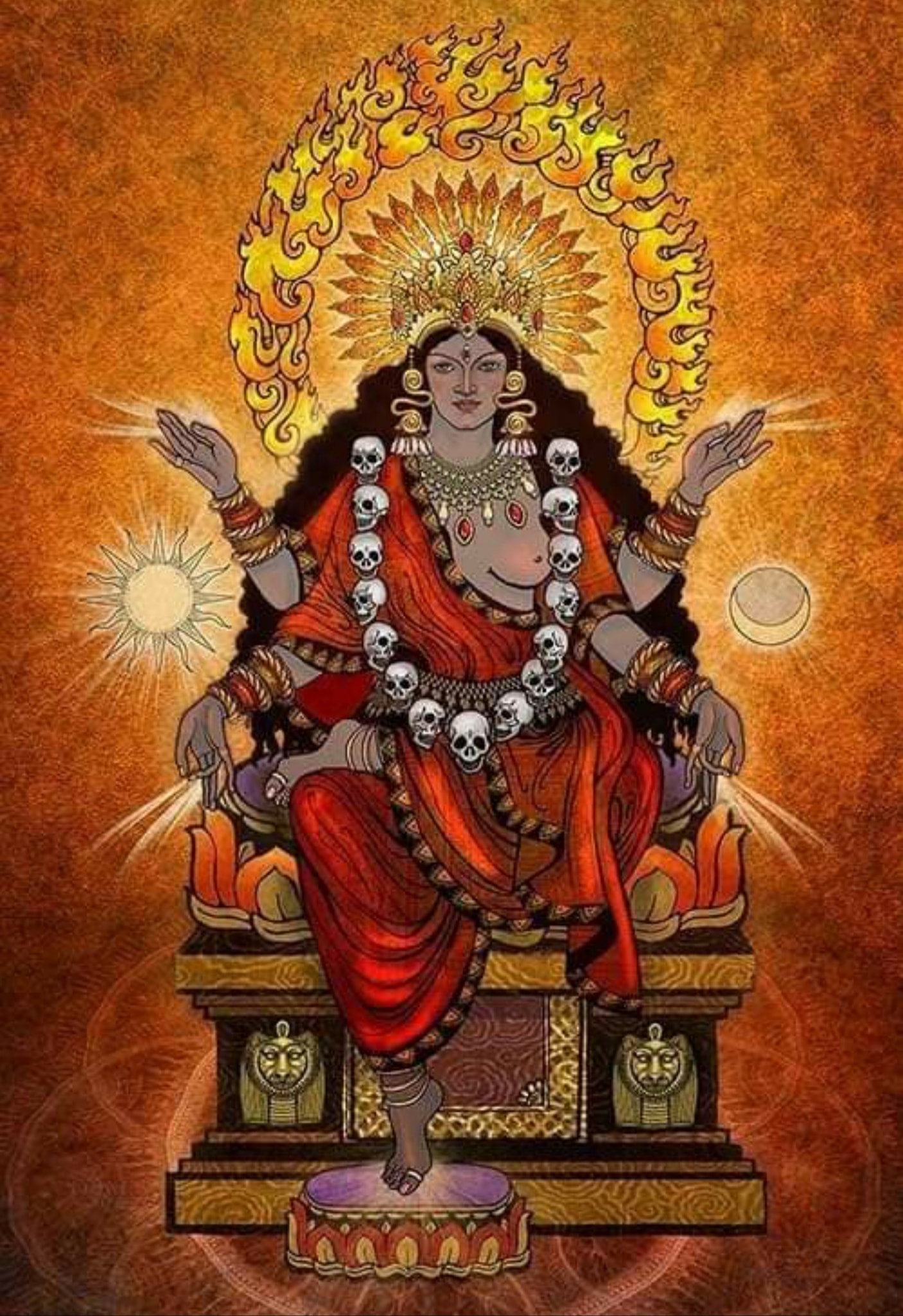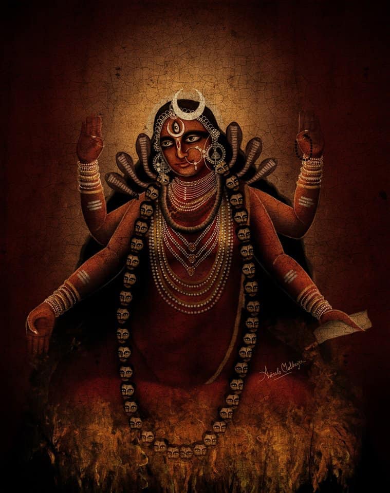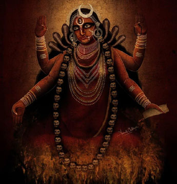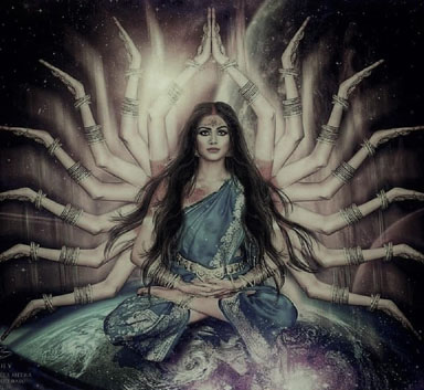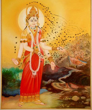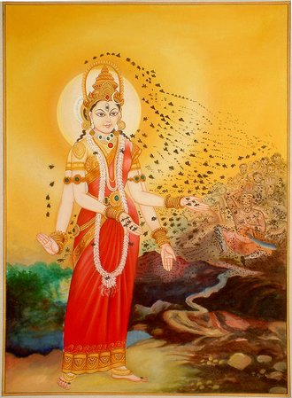 Painting of Bhramari Devi Goddess of the Black Bees by Rama19920 82. Chandrachude namastubhyam chetane vindhyavasini. Jyeshthe shreshthe namah preshthe jwale jagritike namah. 82. You wear as diadem the crescent moon; You are pure Wisdom, living on Mount Vindhya. You are foremost amongst the great and most beloved. Prostrations to You, Flaming One, who brings Awakening. 83. Karalini namastubhyam ekavire namo namah. Namaste durgamaloke, durge durgatiharini. 83. Prostrations to You, Terrifying One. We honor You, of Incomparable Valor. O Splendid Mother, difficult to reach, to You we bow, Durga, Remover of All Pains. 84. Namaste madhavinande, bhramari bhramari namah. Namaste vritrashamani mrigavati namo namah. 84. Prostrations to You, Madhavi, Delightful One; Your names are Bhramari and Bhramari One. Obeisance to You, Slayer of the Demon Vrita. Glory Glory to You Mrigavati. |