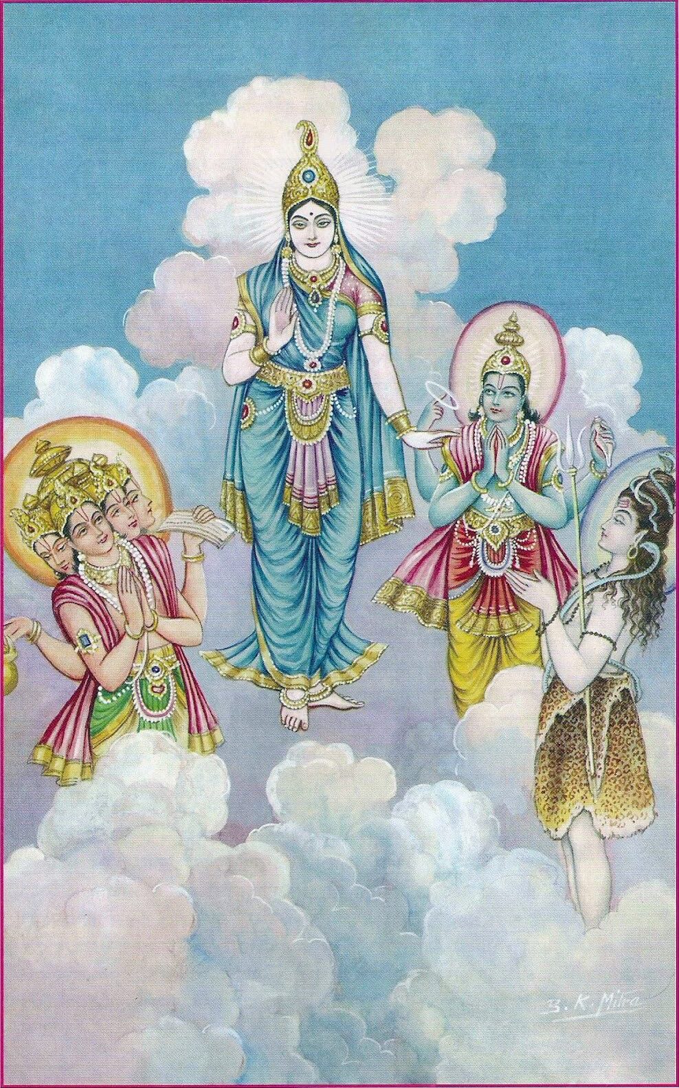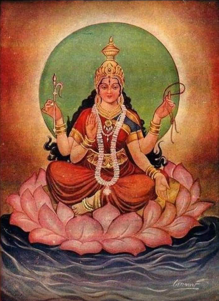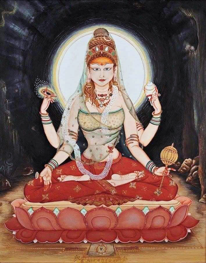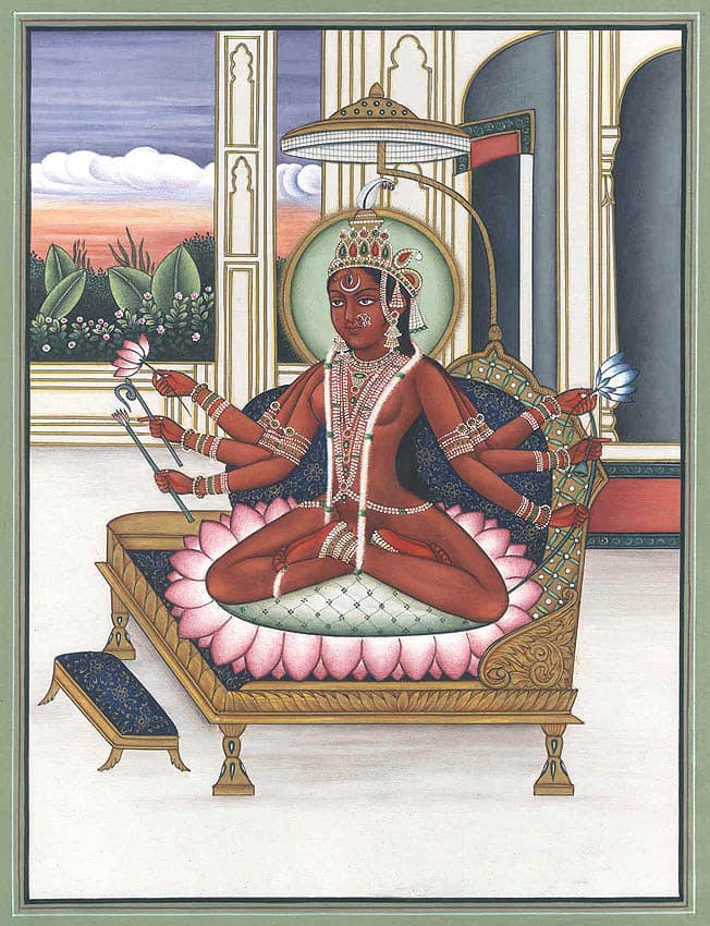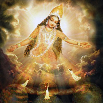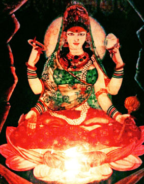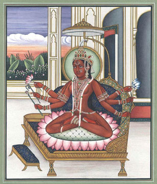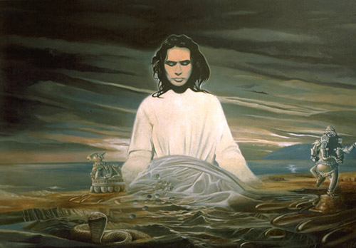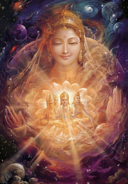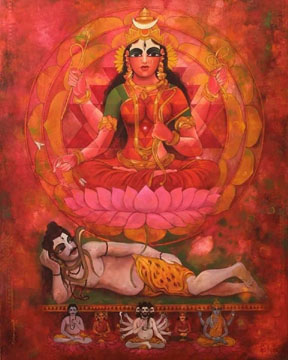 Painting by Paolo Polli 7. Anandarupam chitishaktidiptam vidyam param brahmarasanubhutim. Karunyapurnam gurumurtirupam devim namamah jagadishwarim twam. 7. The Form is bliss, the Force and light of awareness, the knowledge of silence, of the Absolute Brahman. Your Form is the Guru, full of compassion, We bow to You, Devi, Queen of the World. |