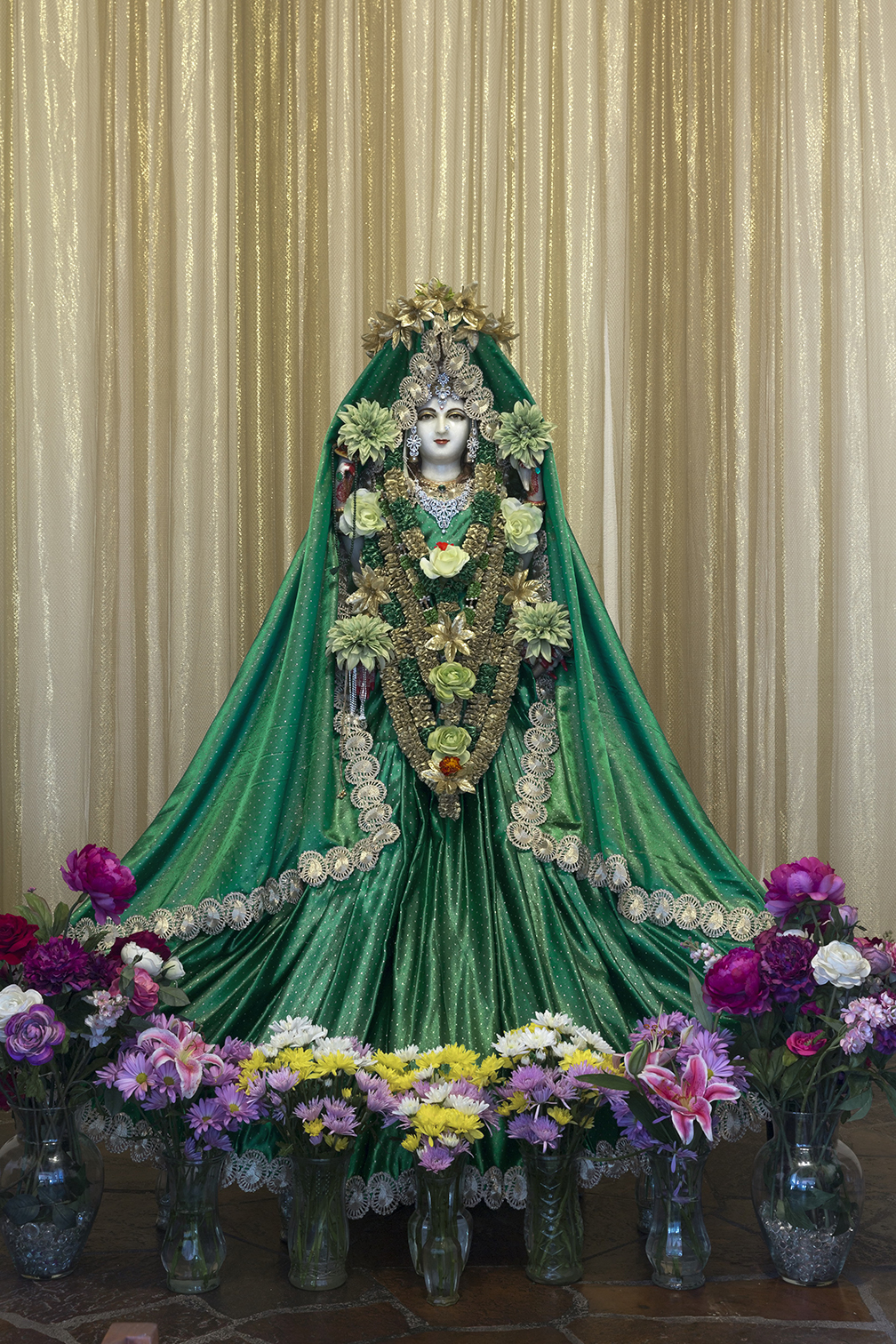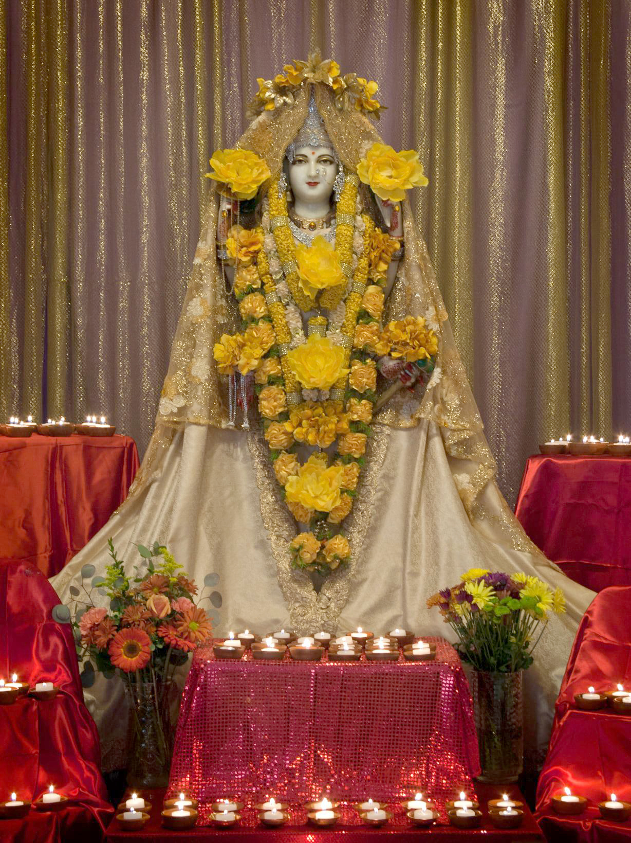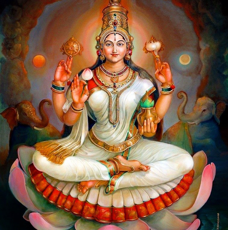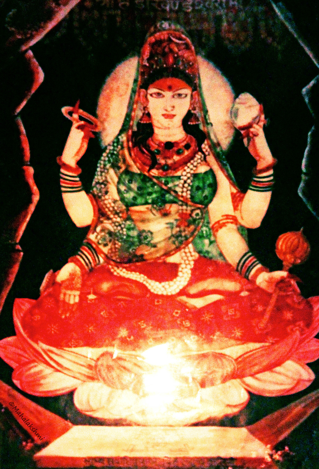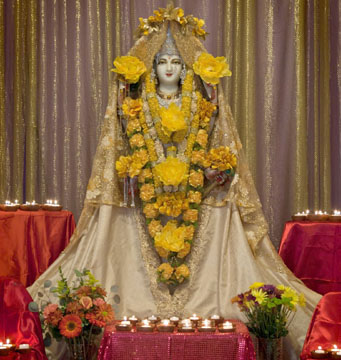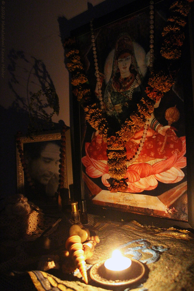 Photo by Mahalakshmi 28. Vanchakalpalate divye, kadambakusumapriye. Mohini twam mahamaye, maheshvari namo namah. 28. You are the tender wish-fulfilling tree and You are fond of the Kadamba flower. Your magic veil conceals the Truth beyond illusion; Consort of Shiva, Glory be to You! 29. Daridryadainyashamani, padmaragamanipriye. Purne vishwambharishani, annapurne namostute. 29. You are alleviating pain and misery. The ruby is Your favorite amongst the gems. Obeisance to You Annapurna Ishani; You nourish and sustain the world with grain. 30. Namaste jagadanandadayini jagadambike. Kalpaprasunamalabhirbhushite varadayini. 30. We bow to You, O Mother Ambika, who fills the Universe with bliss. The garland of the wish-fulfilling flower adorns You, who is granting every wish. |