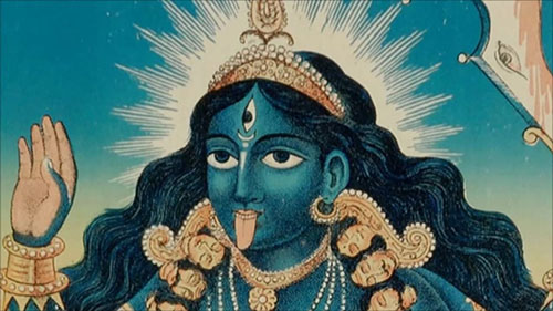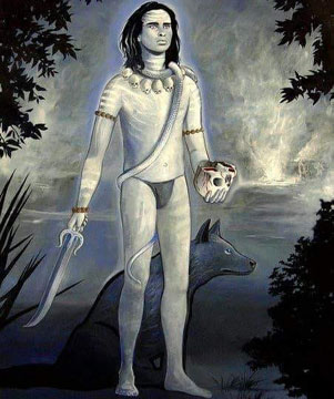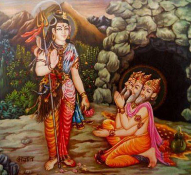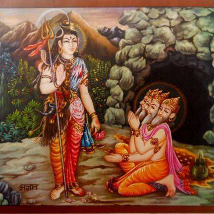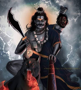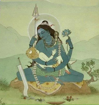 Painting by Paolo Polli. SRI MAHABHAIRAVA STOTRA Om namah shivay. Om shri bhairavaya namah Om kara kalita kapalah kundali dandapanih. taruna timira nilah vyala yajnopaviti. Kratu samaya saparya vighna viccheda hetuh jayati vatuka nathah siddhidah sadhakanam. Om, in one hand He is holding a skull, in the other a staff and He is wearing earrings. His body is deep dark blue and He is wearing snakes as sacred thread. At the time of havan He is the remover of all obstacles. Victory of Lord Batuka, giver of siddhis (spiritual powers) to the disciples. |