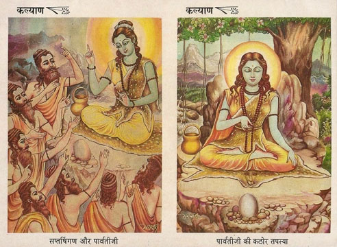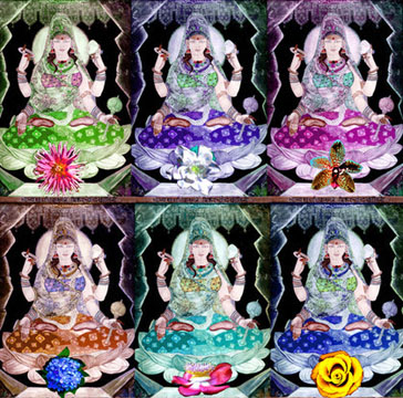 Collage by Mahalakshmi 34. Muktabhushitasarvangabhushite parameshwari. Navavidrumavarnadhye, dhyeyarupe namo namah. 34. O Highest Queen, on every limb, You are bedecked with pearls. We bow to and we meditate on You, appearing in the color of new corals. 35. Jaya sarvagate durge, namastripurasundari. Shabdabrahmamayi matar, vakyasiddhim, prayaccha me. 35. Victory to You, All-pervading Durga, We bow to You Tripurasundari. You are the Very Word of God; Grant that my speech is always one with Truth. 36. Madam churnaya shatrunam chandike darpanashini. Arinam hridayam bhindhi, shulagrena tarasvini. 36. O grind the enemies'* arrogance into the dust and break their pride, O Mother Chandika. O Valient Devi, pierce Your prong right through the enemies' heart. *Enemies are lust, anger, ego, avarice, delusion, jealousy |