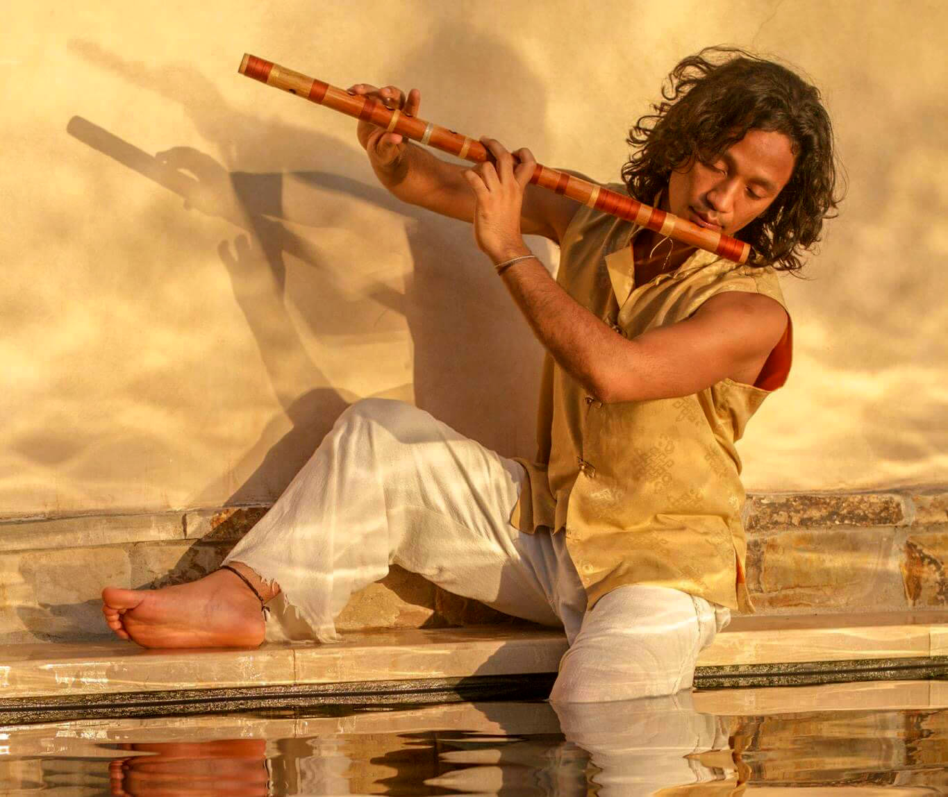 | Here eight-year-old Manose fell in love with the bamboo flute one night when a fortuitous breeze wafted its song through his bedroom window. |