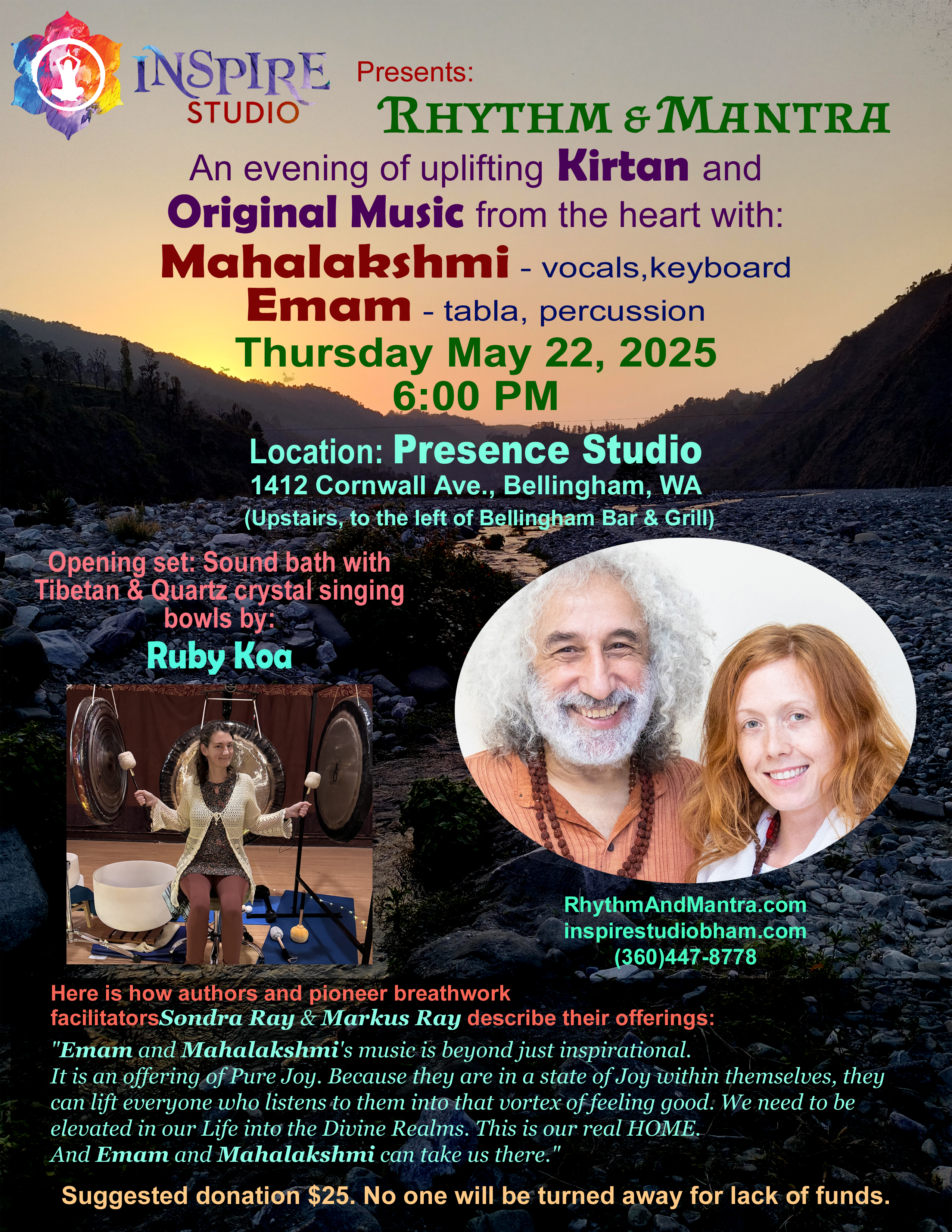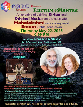 Sondra Ray & Markus Ray describe our offerings: "Emam and Mahalakshmi's music is beyond just inspirational; it is an offering of Pure Joy. Because they are in a state of Joy within themselves, they can lift everyone who listens to them into that vortex of feeling good. We need to be elevated in our Life into the Divine Realms. This is our real HOME. And Emam and Mahalakshmi can take us there." |