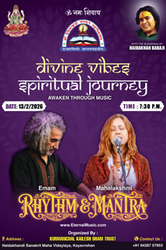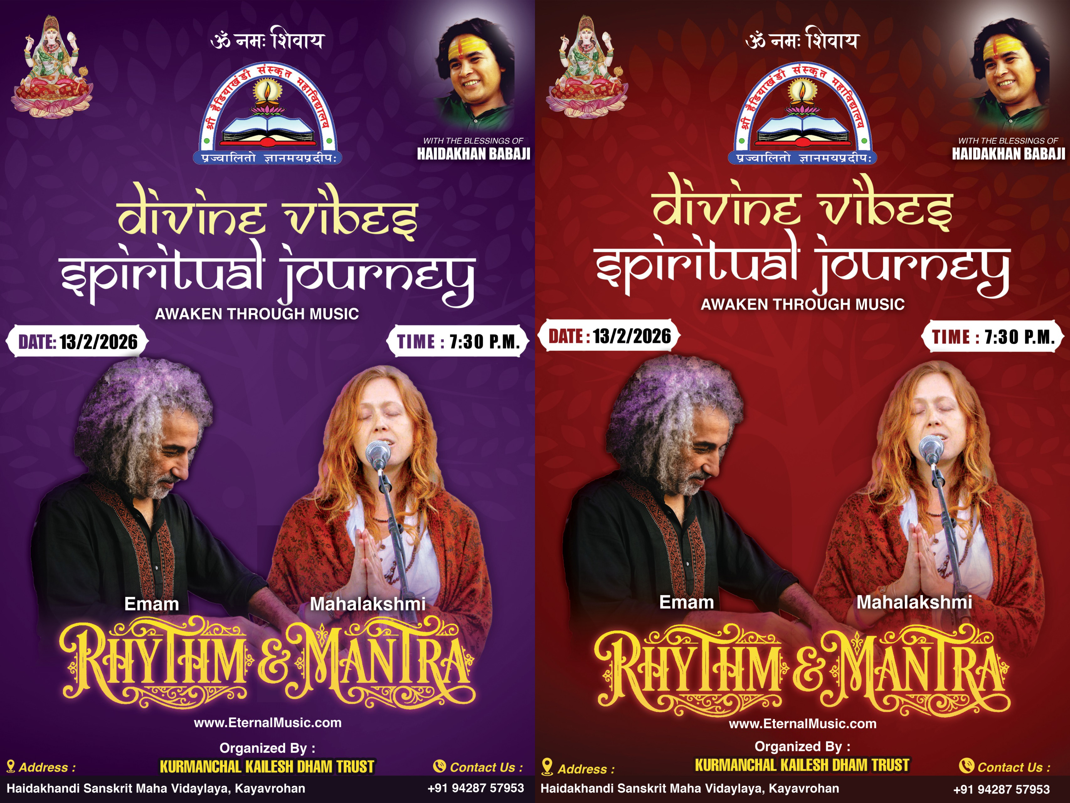 | Kirtan & Music Friday 13th February/2026 - 7:30 PM Rhythm & Mantra Mahalakshmi (vocals, keyboard) Emam (tabla, percussion) Haidakhandi Sanskrit Maha Vidyalaya Kayavrohan, Gujrat (near Vadodara) +91-94287-57953