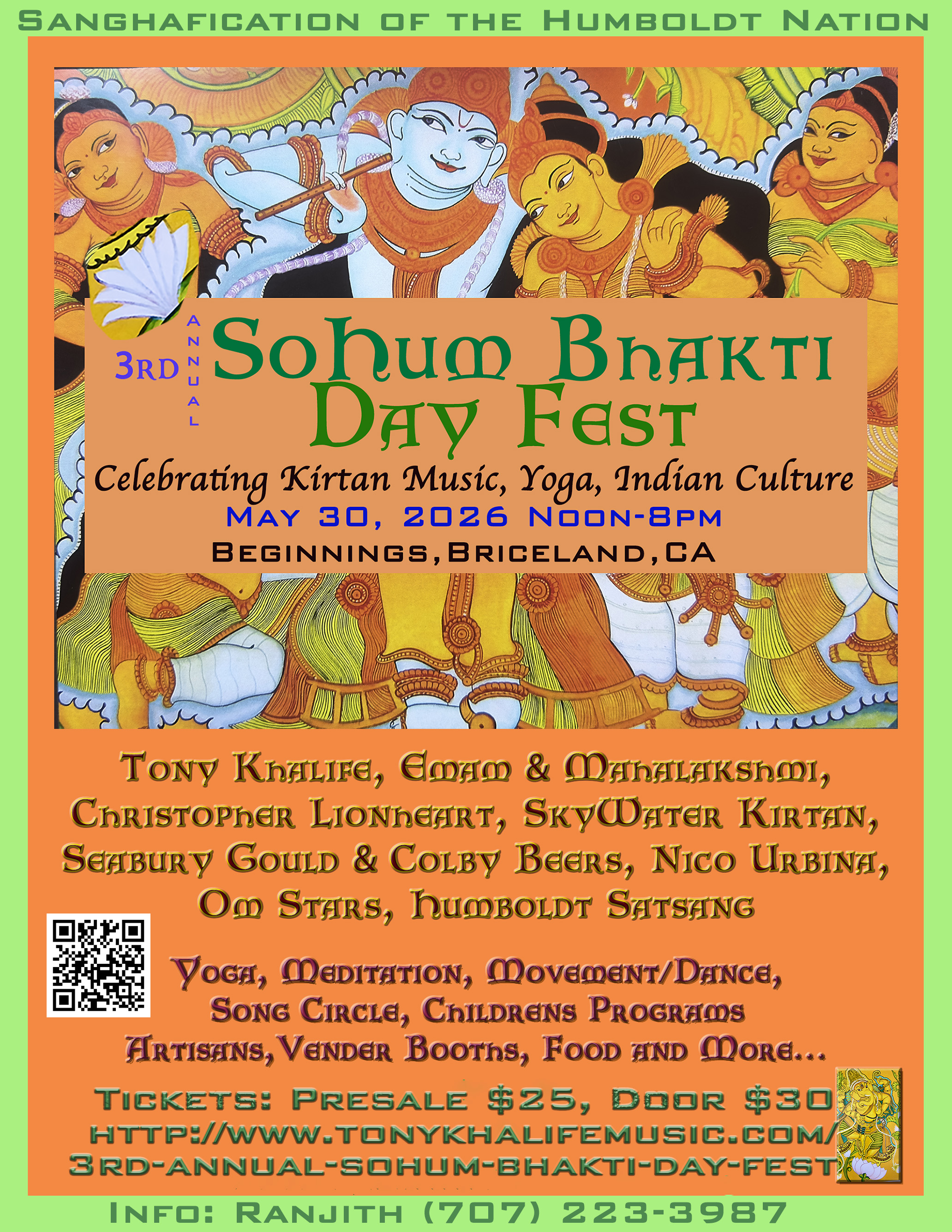 12:00 Noon to 8:00 PM 3rd annual Sohum Bhakti Day Fest Tony Khalife Mahalakshmi & Emam Christopher Lionheart SkyWater Kirtan and many more! Beginnings Briceland, CA