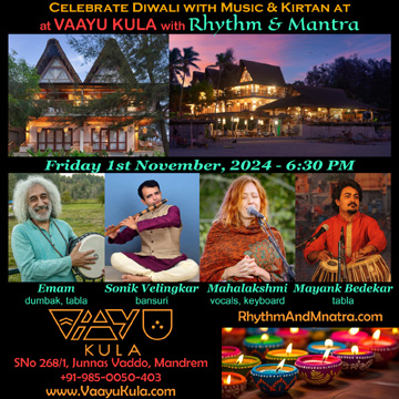 with Kirtan & Music at Vaayu Kula - Mandrem Friday 1st November/2024 - 6:30 PM Rhythm & Mantra Mahalakshmi (vocals, keyboard) Sonik Velingkar (bansuri) Mayank Bedekar (tabla) Emam (tabla, dumbak) Vaayu Kula SNo 268/1, Junnas Vaddo, Mandrem www.VaayuKula.com +91-985-005-0403 | |