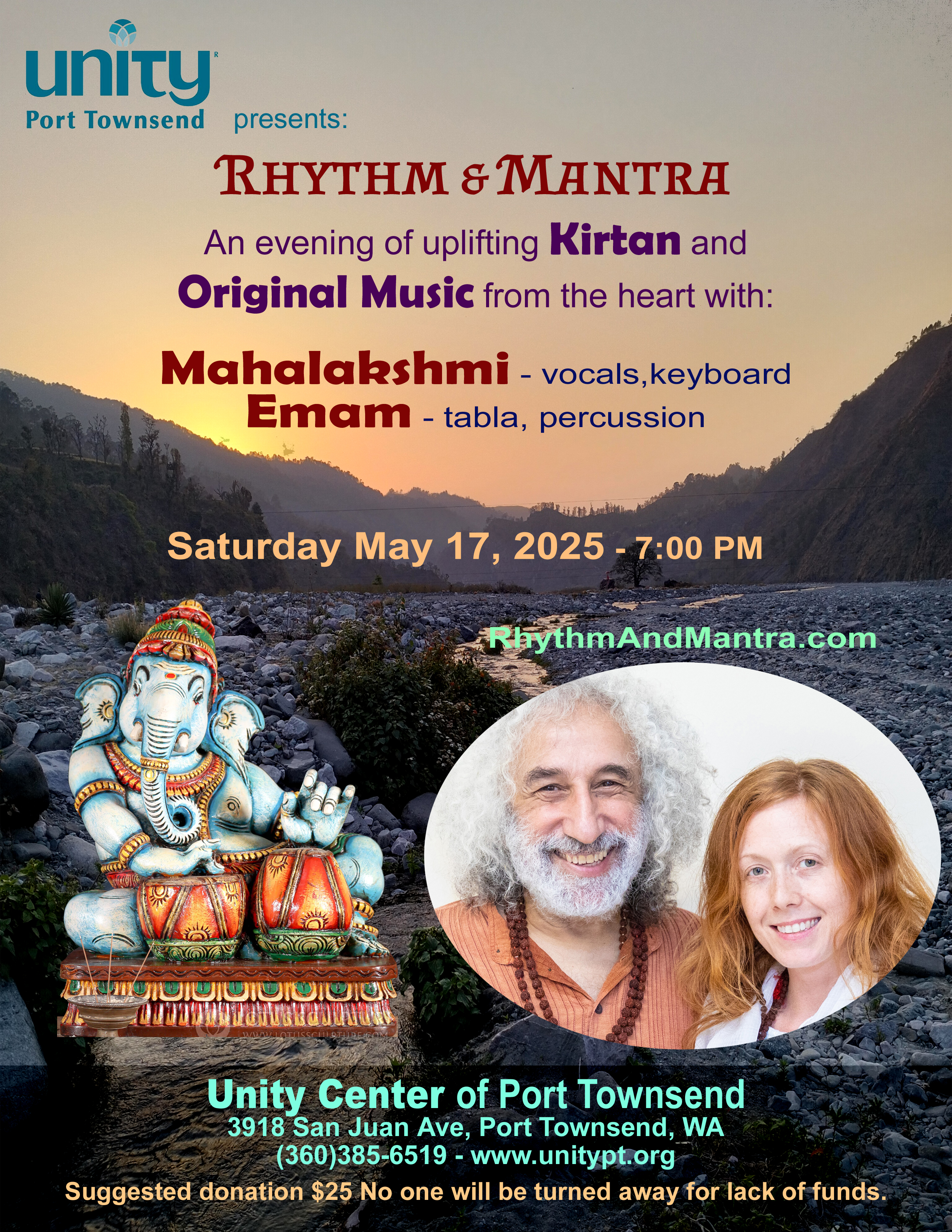 Kirtan & Music Thursday May 7/2026 - 7:00 PM Rhythm & Mantra Mahalakshmi (vocals, keyboard) Emam (tabla, percussion) Unity Center of Port Townsend 3918 San Juan Ave, Port Townsend, WA (360)385-6519 www.unitypt.org | ||||||||||||||||||||||