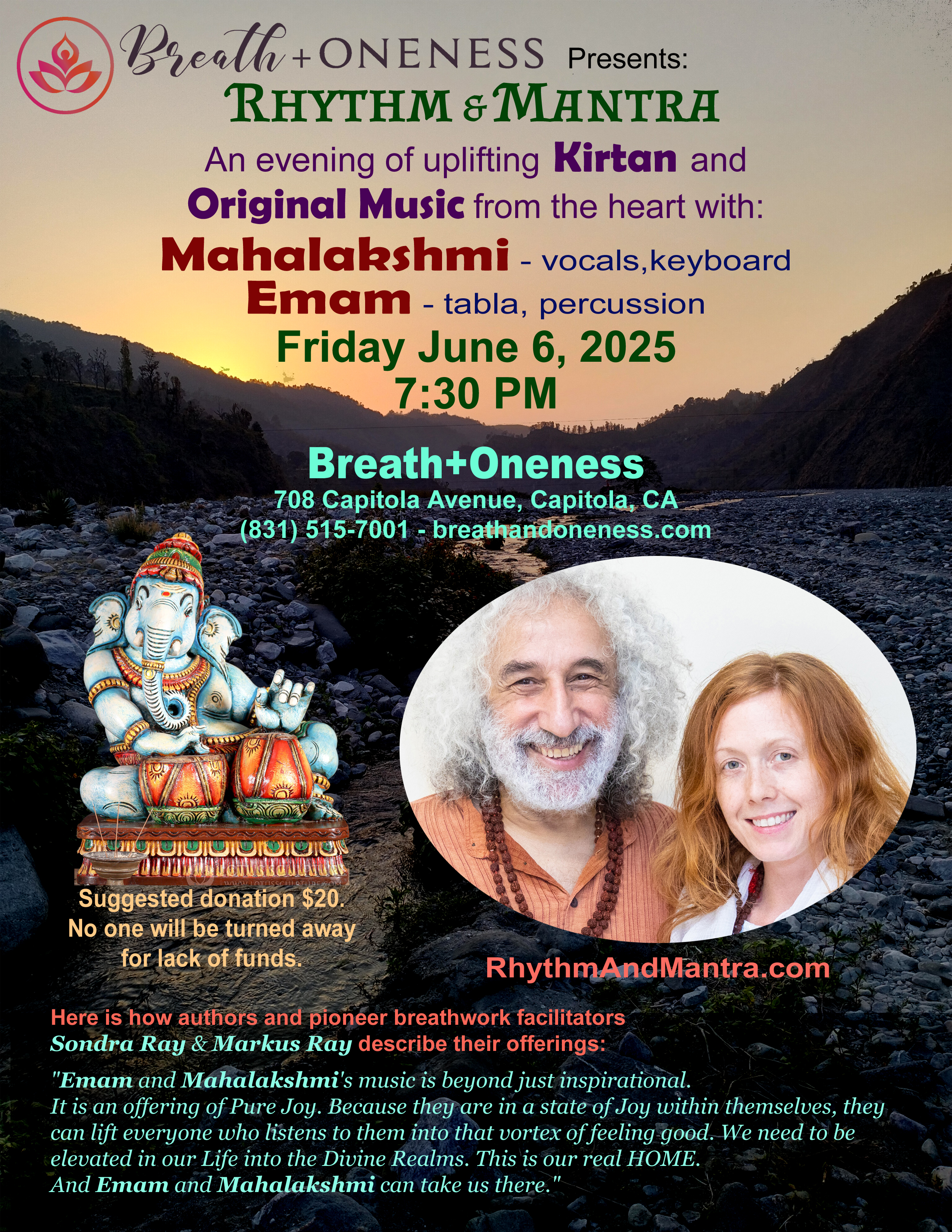 | Two magical evenings of Kirtan & Original Music with Rhythm & Mantra Mahalakshmi (vocals, keyboard) Emam (tabla, percussion) Steve Robertson (percussion) Friday June 5/2026 - 7:00 PM A heart opening spiritual journey through Kirtan Saturday June 6/2026 - 7:00 PM An uplifting evening of original music from the heart Breath+Oneness 708 Capitola Avenue, Capitola, CA 95010 (831) 515-7001 breathandoneness.com