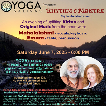 | Kirtan & Music Sunday June 7/2026 - 6:00 PM Rhythm & Mantra Mahalakshmi (vocals, keyboard) Emam (tabla, percussion) Yoga Salinas 44 Plaza Circle Salinas CA (831) 272-4228 yogasalinas.com