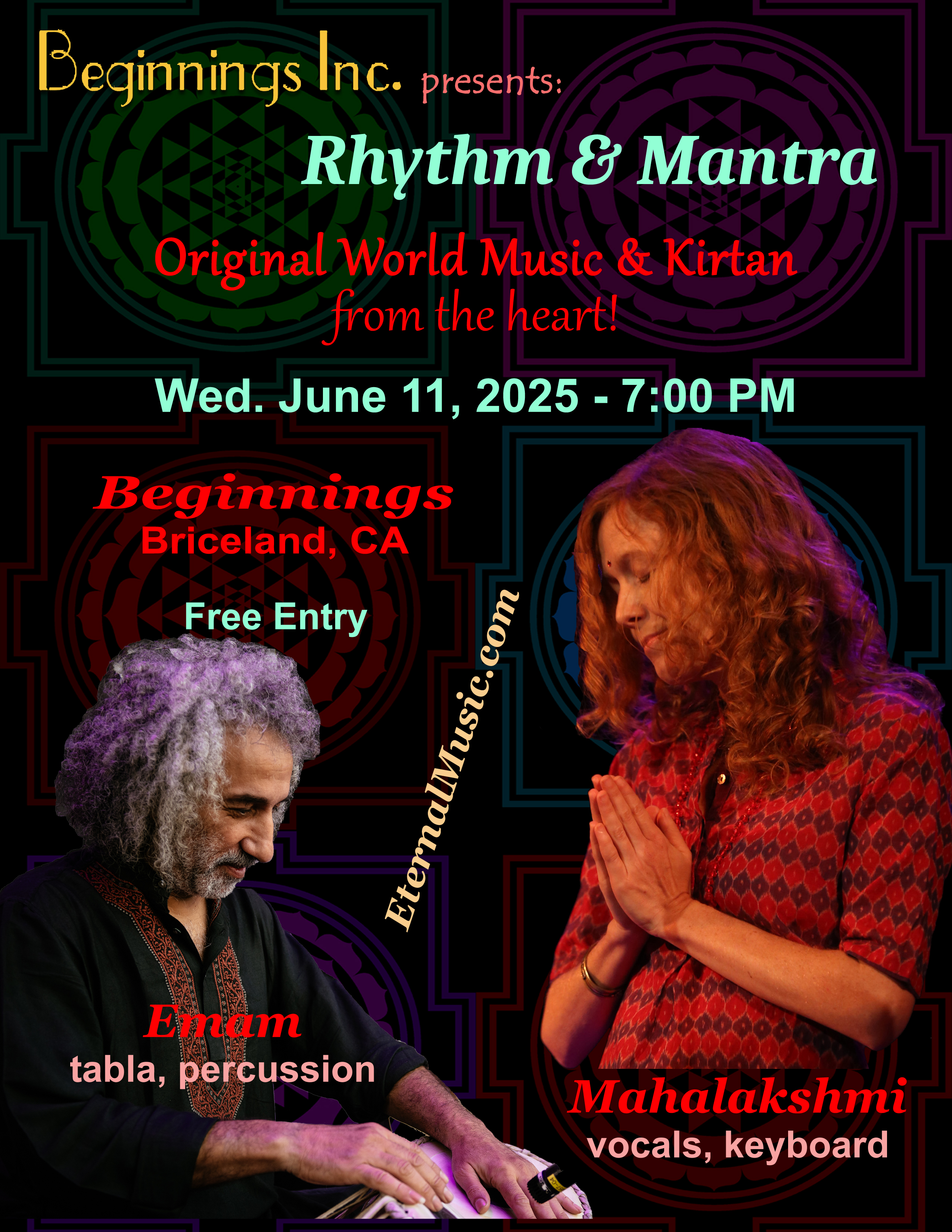 | Kirtan & Music at Beginnings Inc. - Ashland Wed. June 11th, 2025 - 7:00 PM Rhythm & Mantra Mahalakshmi (vocals, keyboard) Emam (tabla, dumbak) Beginnings Inc. 5 Cemetery Rd, Redway, CA 95560 BeginningsBriceland.org (707) 923-3617