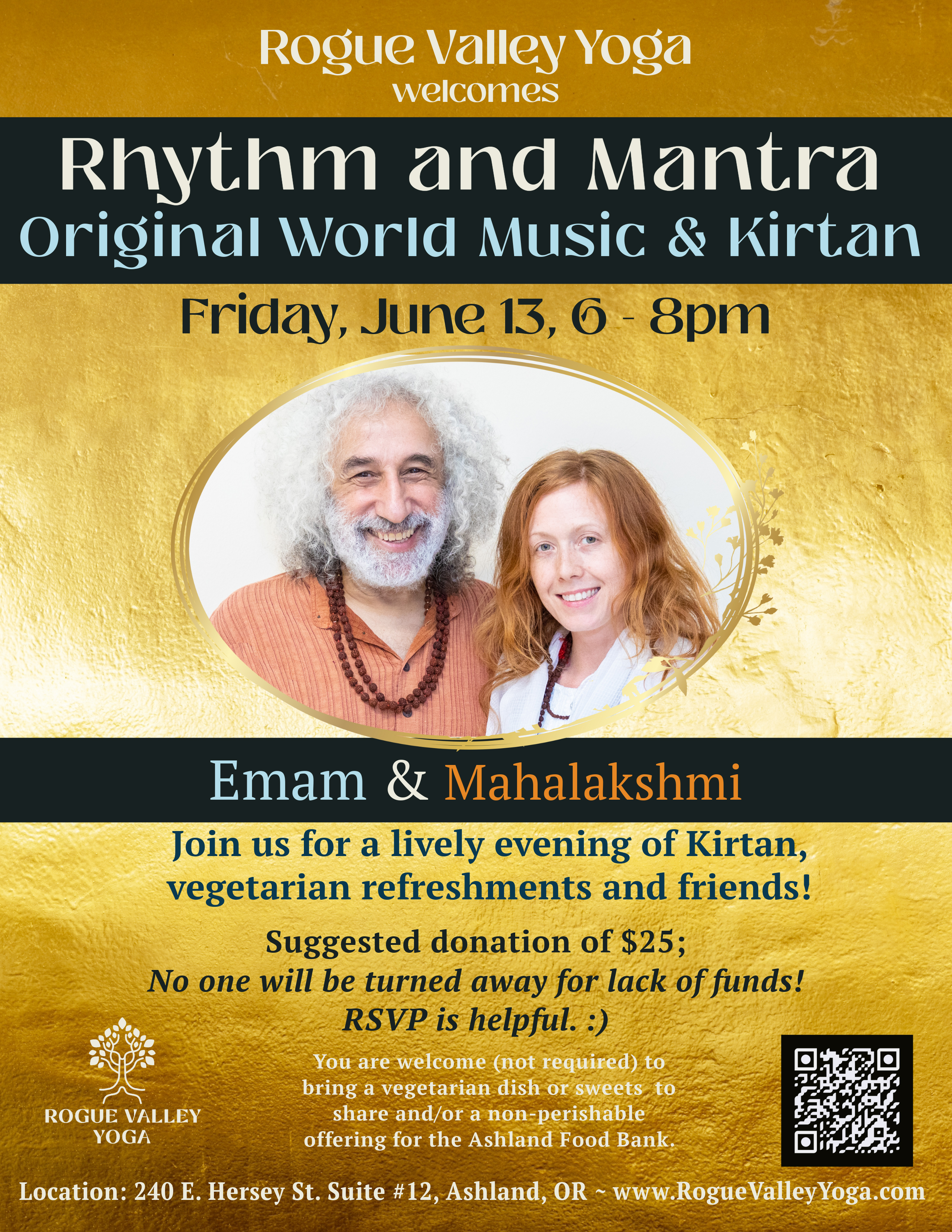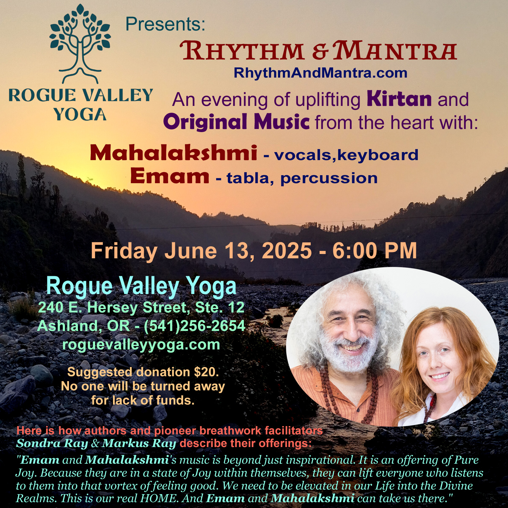 | Kirtan & Music at Rogue Valley Yoga - Ashland Friday June 13th, 2025 - 6:00 PM Rhythm & Mantra Mahalakshmi (vocals, keyboard) Emam (tabla, dumbak) Rogue Valley Yoga 240 E. Hersey Street, Ste. 12, Ashland, OR roguevalleyyoga.com (541)256-2654