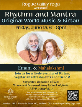 | Kirtan & Music Friday June 12/2026 - 7:00 PM Rhythm & Mantra Mahalakshmi (vocals, keyboard) Emam (tabla, percussion) Rogue Valley Yoga 240 E. Hersey Street, Ste. 12, Ashland, OR (541)256-2654 roguevalleyyoga.com