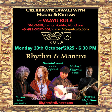 | with Kirtan & Music at Vaayu Kula - Mandrem Monday 20th October/2025 - 6:30 PM Rhythm & Mantra Mahalakshmi (vocals, keyboard) Mukesh Sharma (sarod) Antonio Mafaldino (guitar) Emam (tabla, percussion) Vaayu Kula SNo 268/1, Junnas Vaddo, Mandrem www.VaayuKula.com +91-985-005-0403